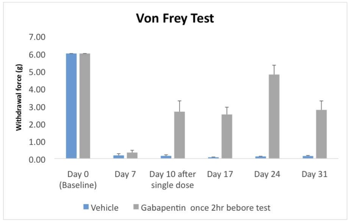 The figure shows the pain response in rats using von Frey. The withdrawal force in treated animals is higher throughout the study compared to the vehicle group.